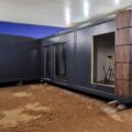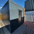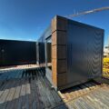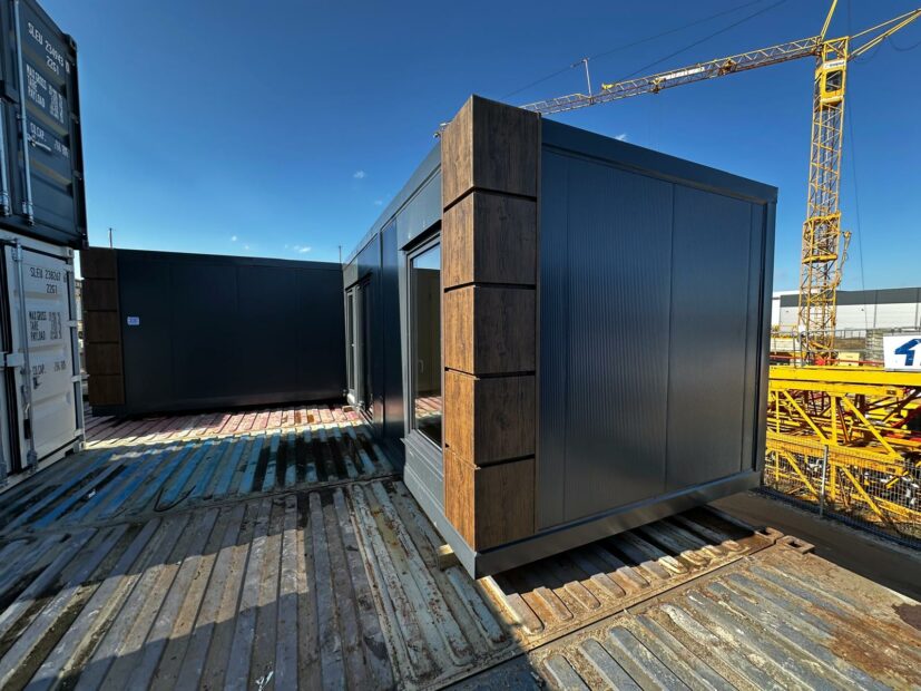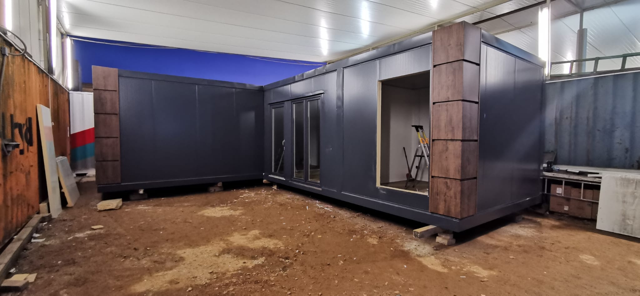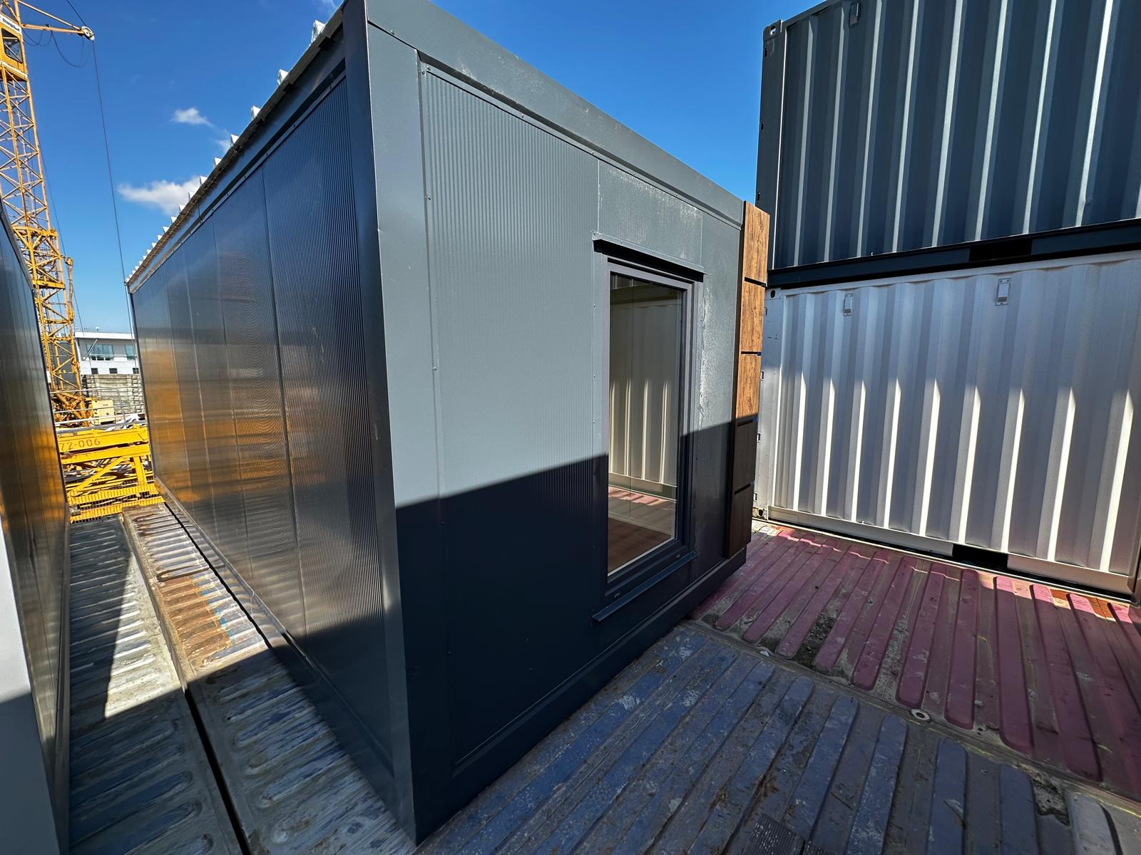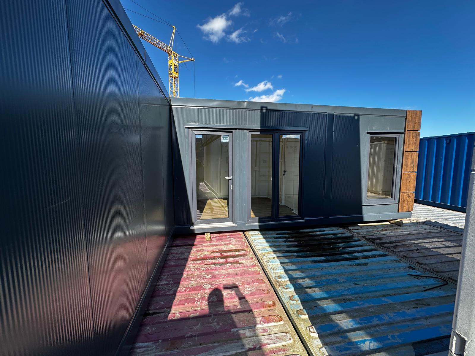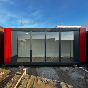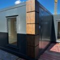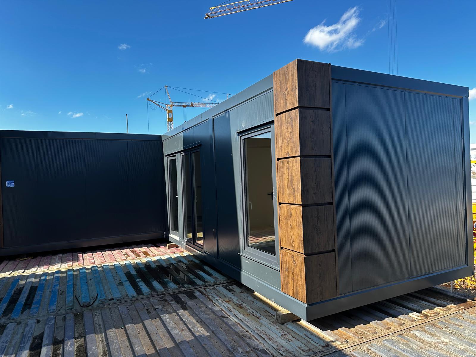 Komplet dwumodułowy w układzie L złożony z dwóch modułów . Antracytowa bryła akcentowana kasetonami drewnopodobnymi na narożach tworzy nowoczesną, reprezentacyjną formę. Fronty wyposażono w kilka witryn 100×180 oraz drzwi przeszklone, co zapewnia bardzo dobrą ekspozycję i doświetlenie. Standard obejmuje ściany z płyt PIR 100 mm, instalację elektryczną i oświetlenie LED; dostępne doposażenie m.in. w sanitariat i klimatyzację.