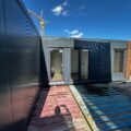Pawilon biurowo-mieszkalny / handlowy narożny w kształcie litery L – antracyt, kasetony drewnopodobne