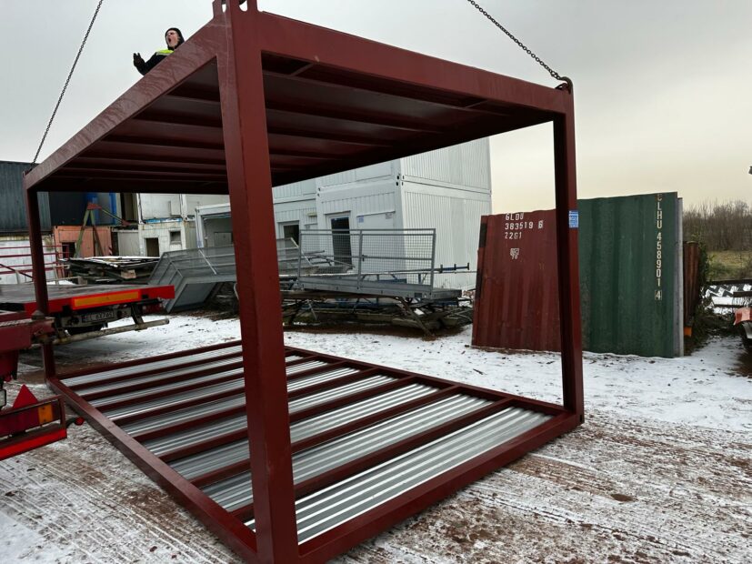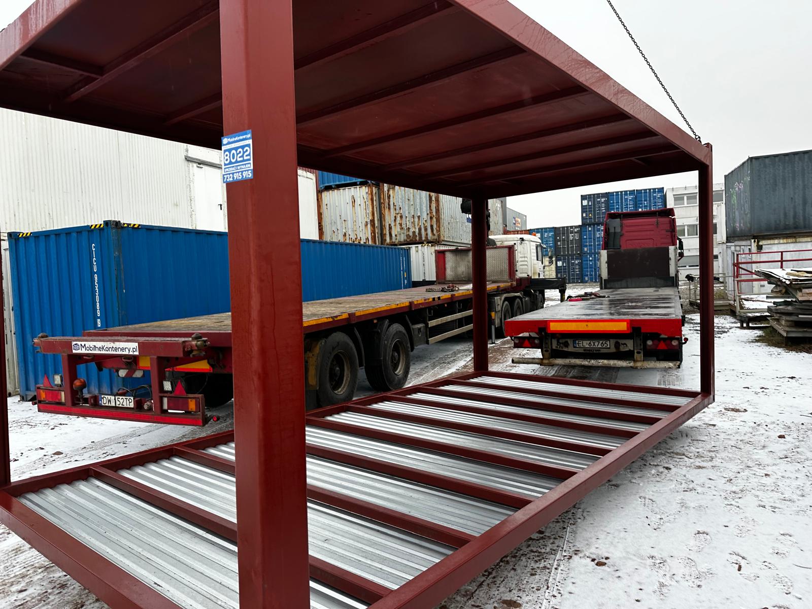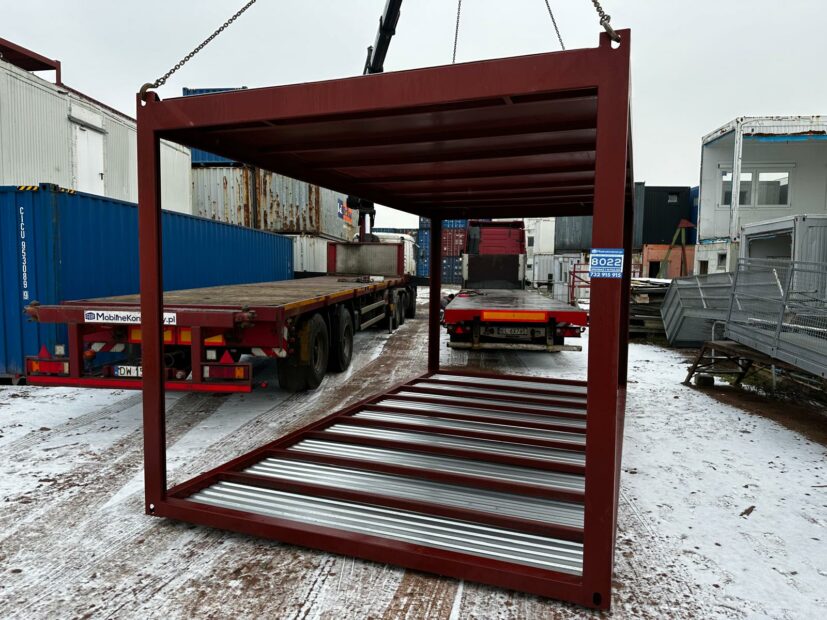 Nowa rama stalowa pod budowę kontenerów biurowych lub mieszkalnych – pokryta farbą antykorozyjną, posiada dach oraz okucie z blachy cynkowanej w podłodze, odwodnienia narożne. Gotowa baza do produkcji. NA ZAMÓWIENIE.
